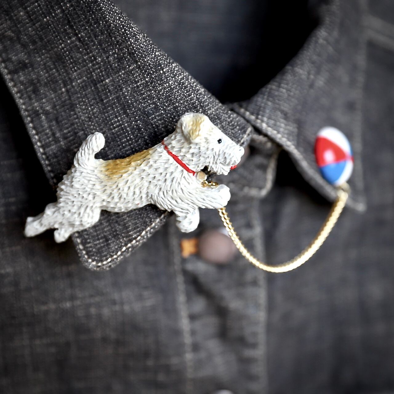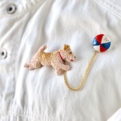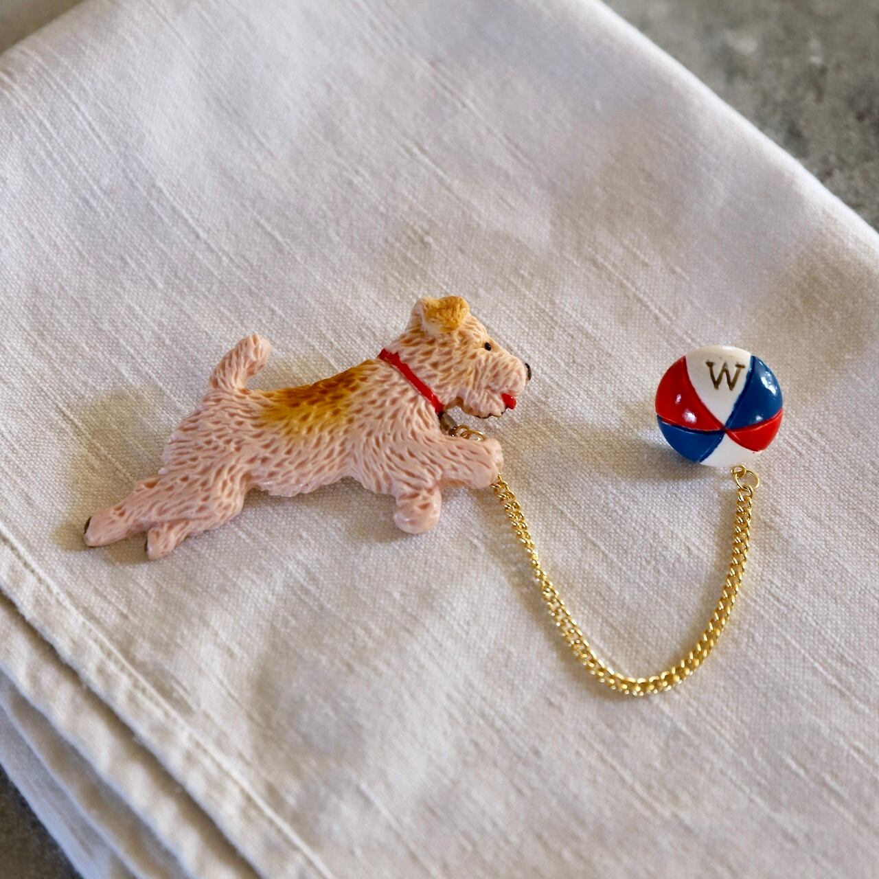 テリアとボールがチェーンで繋がっているブローチです。動くとチェーンが揺れてすごく可愛いです。